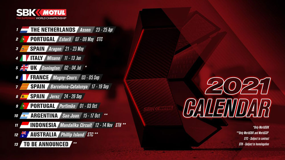 El 2021 viene complicado para todos los campeonatos, y la temporada 2021 del SBK no es la excepción. Debido a la pandemia, el inicio del campeonato se retrasa hasta el mes de abril, quedando atrás la fecha inaugural usualmente establecida para el mes de febrero en Australia que por el momento no dispone de fecha confirmada.