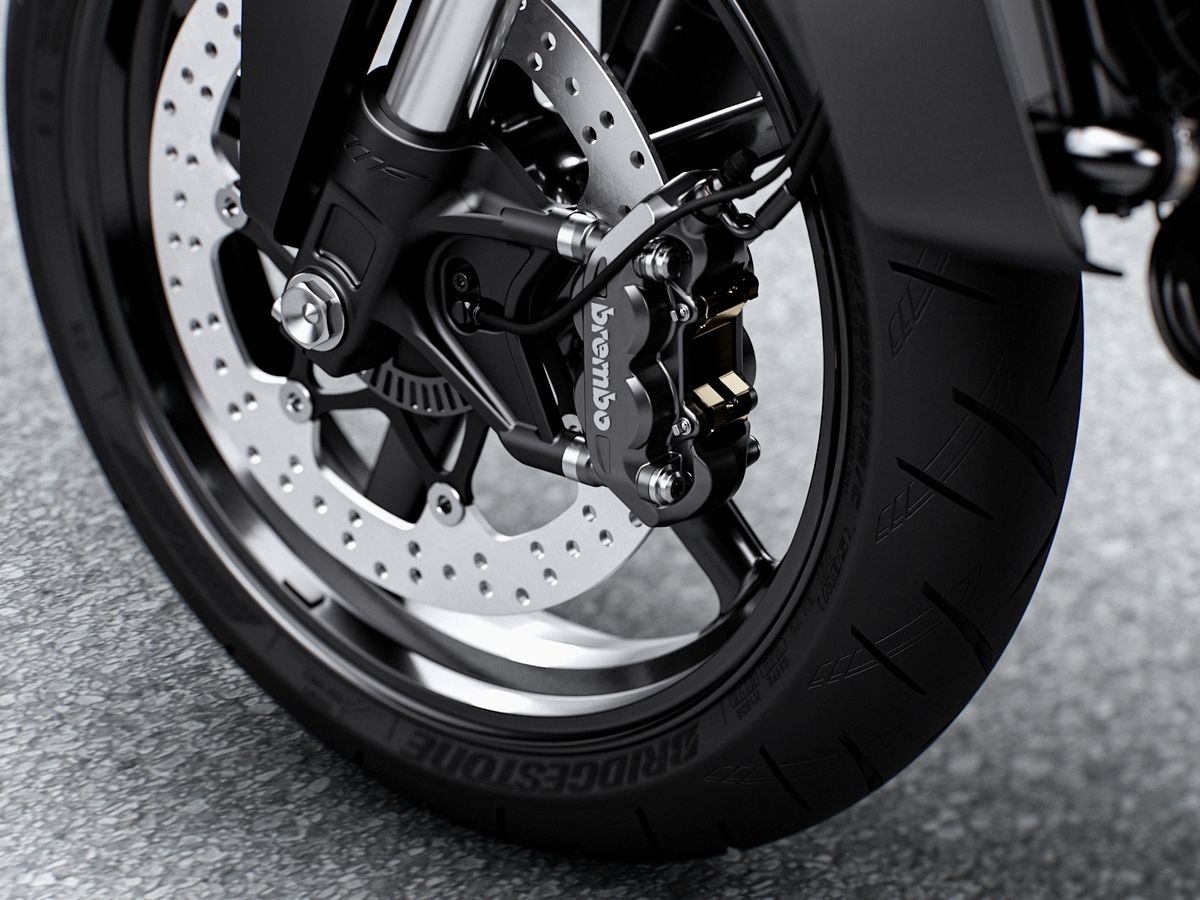 Cuenta con un disco delantero de 320 mm de diámetro, mordido por pinzas de anclaje radial de cuatro pistones marca Brembo. El trasero es un disco de 240 mm, ambos asistidos por ABS Bosch.
