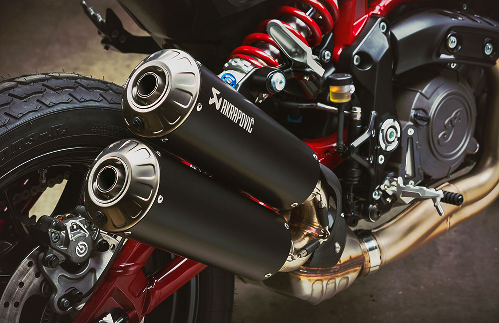 Suspensión y chasis permanecen iguales a los del modelo FTR, conservando una horquilla delantera ajustable, con 150 mm de recorrido y la frenada a cargo de unas pinzas Brembo. En lo que hace a equipamiento, cuenta con control de tracción, ABS desconectable, luces full LED y tablero compuesto por una pantalla táctil LED de 4.3 pulgadas, puerto USB y conectividad Bluetooth para control de dispositivos.