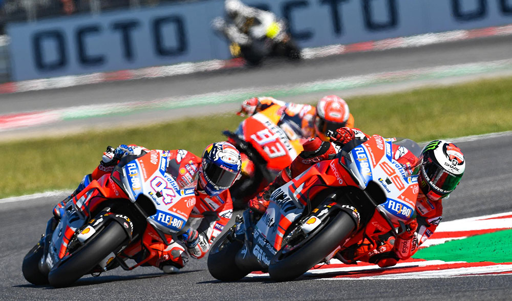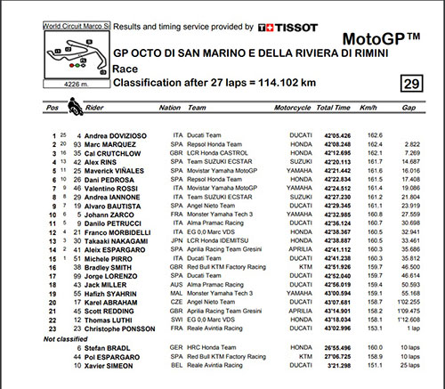 «Quería mucho esta victoria, porque aquí en Misano, he luchado juntamente con Ducati en los últimos años. En la prueba de agosto sin embargo nos dimos cuenta de que habíamos dado un paso importante y que podíamos ser competitivos en la carrera. Trabajamos muy bien durante el fin de semana, en condiciones muy diferentes, pero tanto Jorge como Marc son muy fuertes aquí así que para ganar tuve que hacer una carrera perfecta. Comencé en el estado de ánimo correcto, centrado completamente en la estrategia de carrera, y cuando tomé la iniciativa, saqué una pequeña ventaja y luego manejé la situación hasta el final. Estoy muy contento, porque ganar aquí en Misano fue muy importante para Ducati, pero también para mí. Hace años parecía como un sueño imposible, pero ahora lo hemos hecho y eso me llena de mucha satisfacción», declaraba Andrea Dovizioso tras ganar la carrera.
