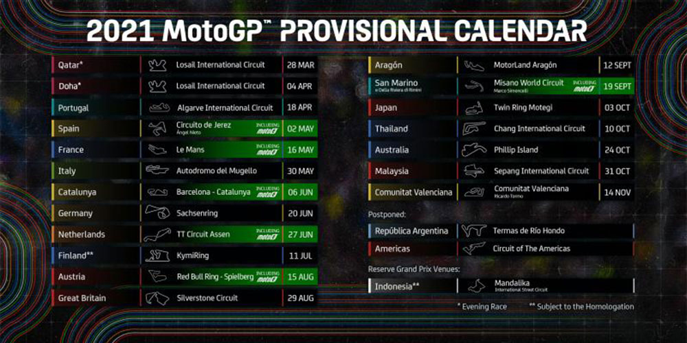 La FIM, la IRTA y Dorna Sports ya pueden revelar un calendario actualizado del Campeonato del Mundo FIM MotoGP™ de 2021, ya que el inicio de otra emocionante temporada de carreras asoma por el horizonte, con la acción de los Test ya prevista para comenzar en poco más de un mes.