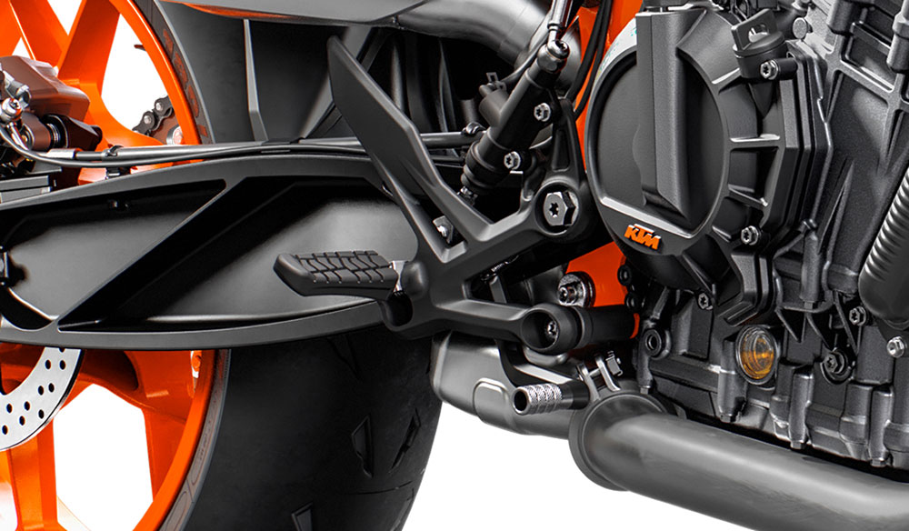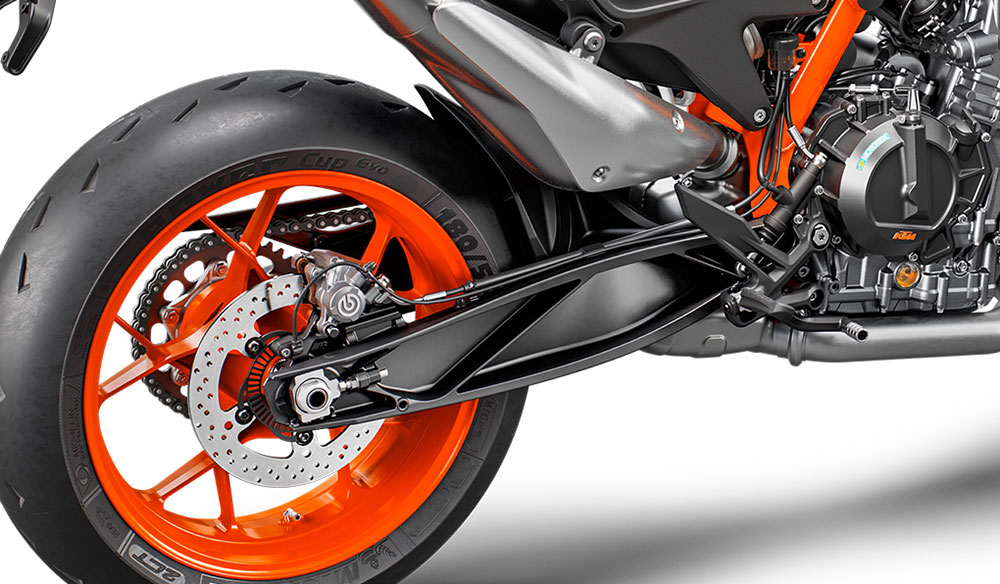 Por debajo del subchasis, el basculante fundido con un diseño abierto aumenta la estabilidad del conjunto de la suspensión trasera. A su vez, se ha aumentado en 15 mm la altura libre al suelo con respecto a la 790 para mejorar el manejo y la altura del asiento se ubica en 840 mm, siendo también más alta que la KTM 790.