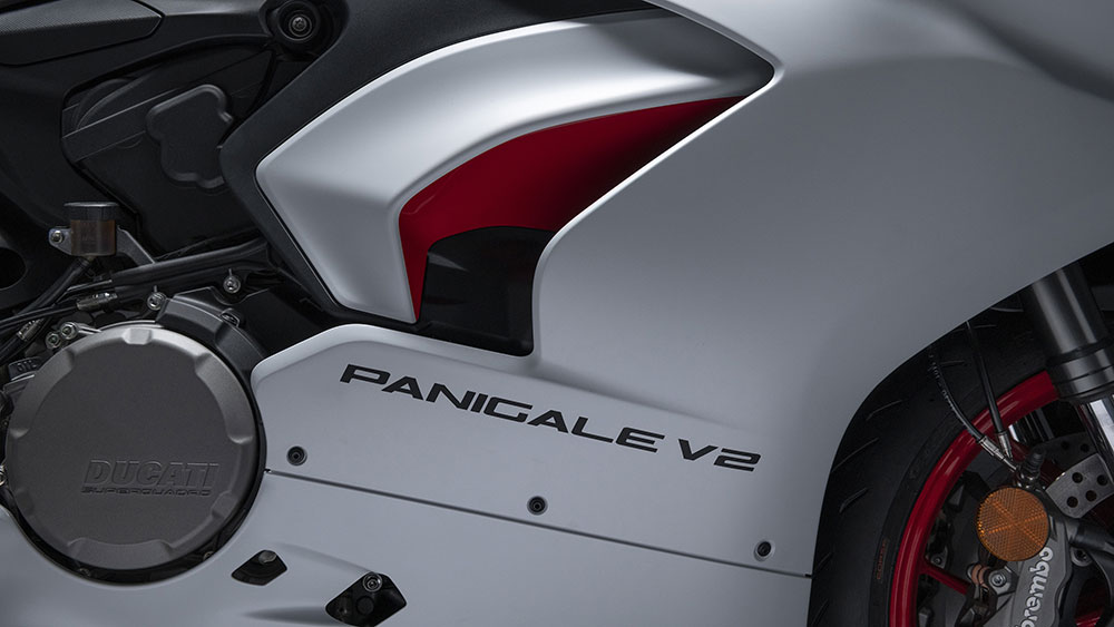 La Ducati Panigale V2, presentada el pasado mes de noviembre, agrega una nueva decoración “White Rosso”, que tiene a color blanco “Star White Silk” como principal. El blanco dominante resalta el diseño de la Panigale V2, destacando las líneas y la pureza de las formas geométricas. Al mismo tiempo, los detalles en “Rosso Ducati” realzan su carácter deportivo y potente. El rojo se encuentra en las llantas, las tomas de aire delanteras y los deflectores de los carenados superiores, que sirven para direccionar el flujo de aire al motor y radiador. A su vez, la leyenda Panigale V2 en la parte inferior de los carenados, se inspira en los gráficos de las motocicletas de Ducati Corse.