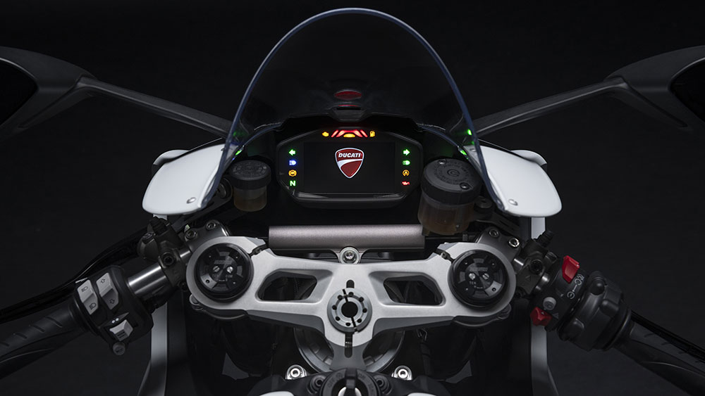 El completo y moderno equipo electrónico, basado en la plataforma inercial de 6 ejes, no deja dudas sobre el ADN deportivo de la moto. El paquete electrónico, dedicado a la seguridad activa y al control de la dinámica del vehículo, incluye la funcionalidad «cornering» de asistencia en curvas aplicado al ABS de Bosch, una caja de cambios electrónica, con controles también en reducciones y tracción y freno motor. Todos los controles se integran en los tres Riding Modes (Race, Sport y Street) que se pueden modificar a través de la pantalla a color TFT de 4,3” con gráficos e interfaz diseñados para hacer que la navegación por el menú y los ajustes de la configuración sean intuitivos, así como la identificación inmediata del Riding Mode seleccionado.