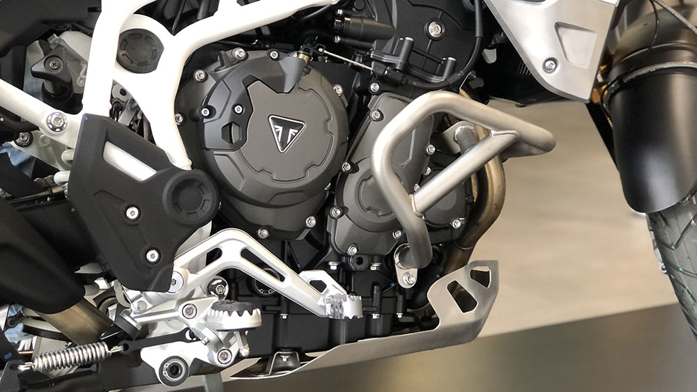 Esta nueva británica viene a reemplazar a la Tiger 800; ya que su principal y más evidente cambio está en su nuevo motor tricilíndrico de 888 cc (antes 800 cc), el cual permite superar la normativa Euro 5, a la vez que gana un 10% más de par máximo (87 Nm a 7250 rpm), con una curva de potencia más llena en todo el rango de revoluciones (+9% a medio régimen) llegando a 95 cv y, curiosamente, un nuevo orden de encendido 1-3-2 para tener un carácter más marcado que además le aporta un sonido diferente y distintivo.