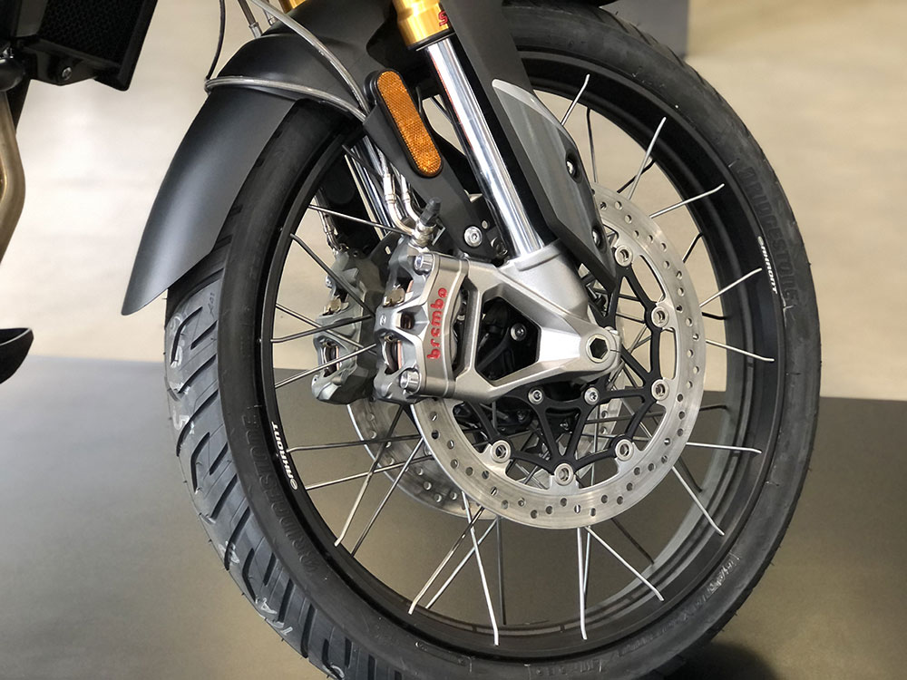 Triumph Tiger 900 Rally: como su nombre lo indica, es la vertiente más off-road, debido a que en este caso se ha optado por unas suspensiones Showa de mayor recorrido (240 mm adelante), regulable manualmente; y atrás un monoamortiguador también Showa regulable en precarga y extensión. Adelante lleva una llanta de rayos de 21″ y atrás de 17″. Los puños calefaccionados son de serie, al igual que los 4 modos de conducción, control de tracción y de velocidad crucero. El tablero es de 7 pulgadas.